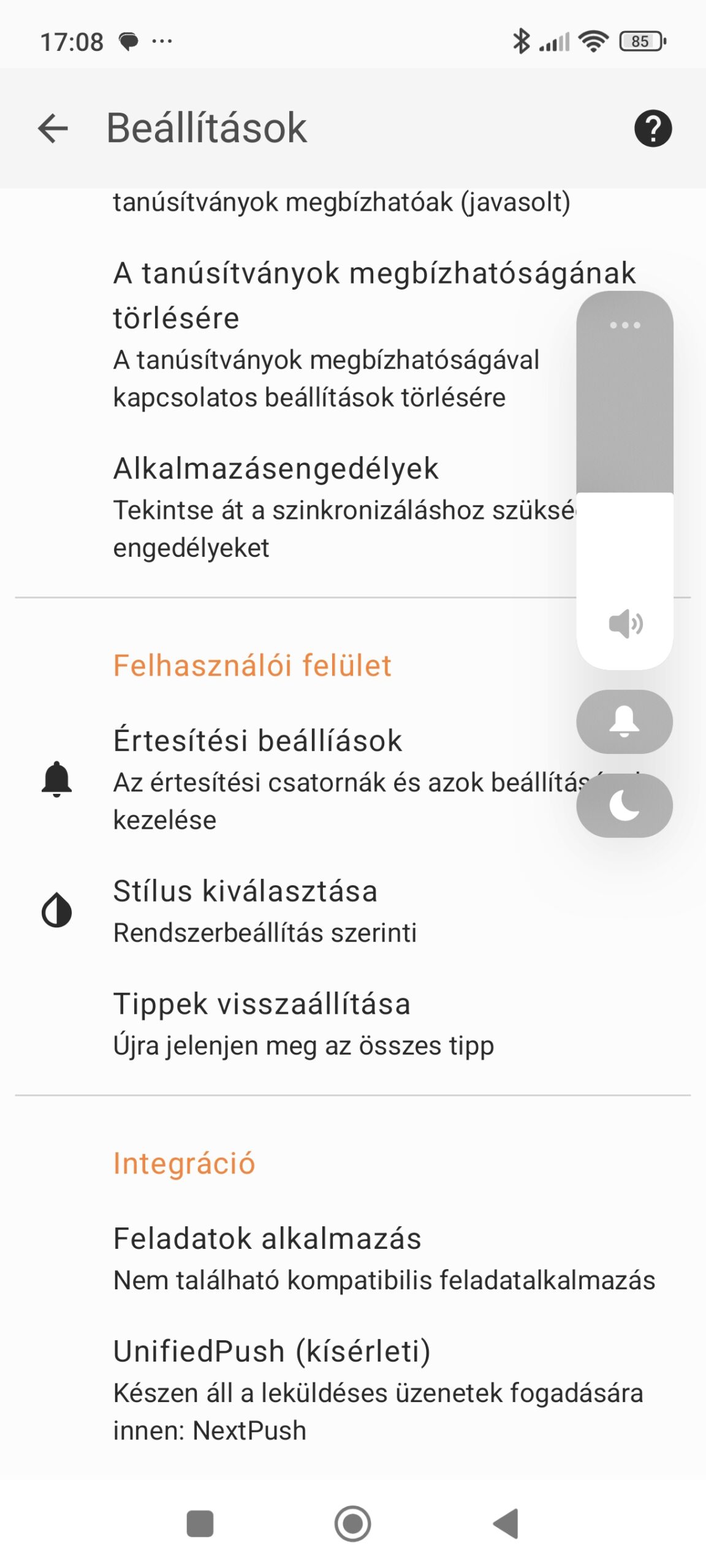 Indítsuk el a NextPush alkalmazást, majd a fiókadatunkkal kapcsolódjunk a nextcloud szerverhez. Miután megvagyunk, indítsuk el a DavX5 applikációt és szintén lépjünk be a nextcloud szerverünkre. Amennyiben rámegyünk a frissen csatlakozott DavX5 fiókra, beállíthatjuk a szinkronizálás idejét és egyéb módon hangolhatjuk az adatok szinkronizálását. Az applikáció fő beállításai között találjuk a „unifiedPush” beállítást, itt válasszuk ki a NextPush szolgáltatót.