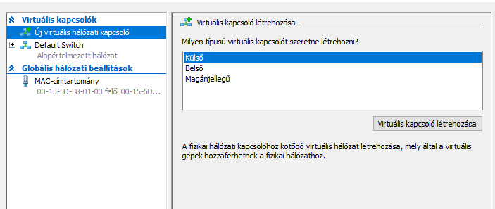 Létre kell hoznunk egy virtuális switch-et. A switch-hez hozzárendelhetjük a fizikai gépünk egy valós hálózati adapterét is, vagy az adapter maga is lehet virtuális. Jelenleg a másodikra adok példát:
